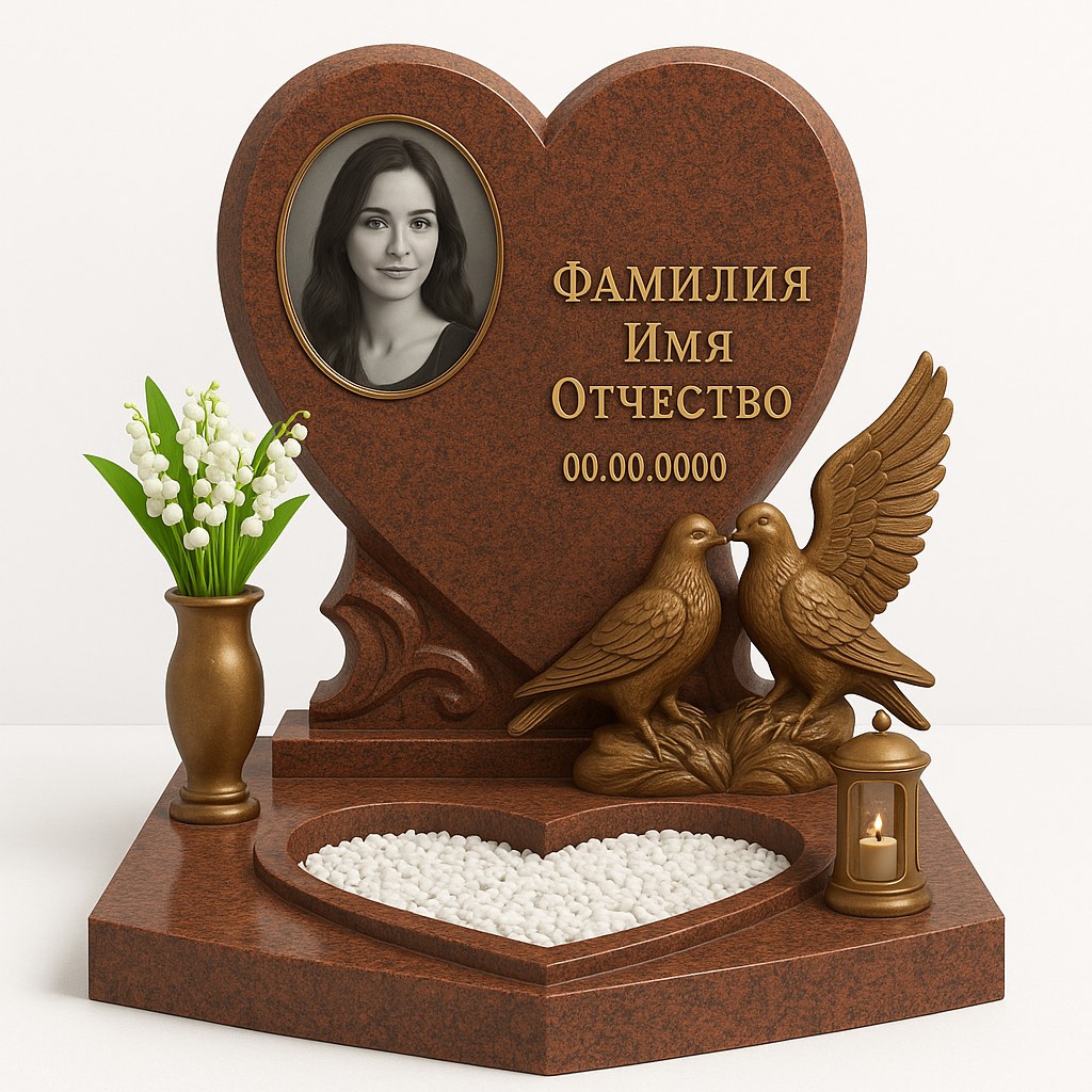 Изысканный памятник, выполненный из натурального лезниковского гранита, оформлен в форме сердца с художественно проработанным основанием и декоративными запилами. Модель идеально сочетает прочность, элегантность и символику светлой памяти.