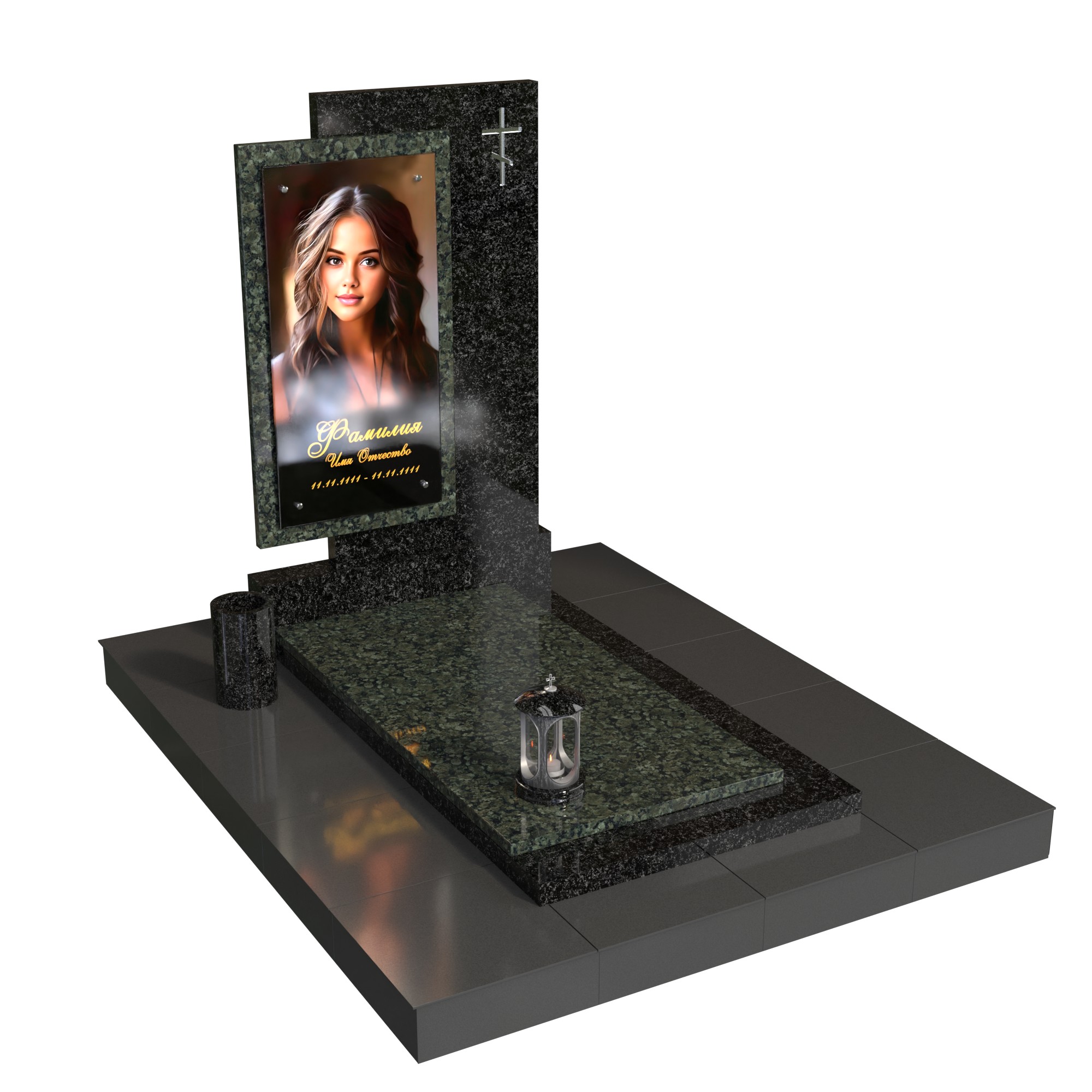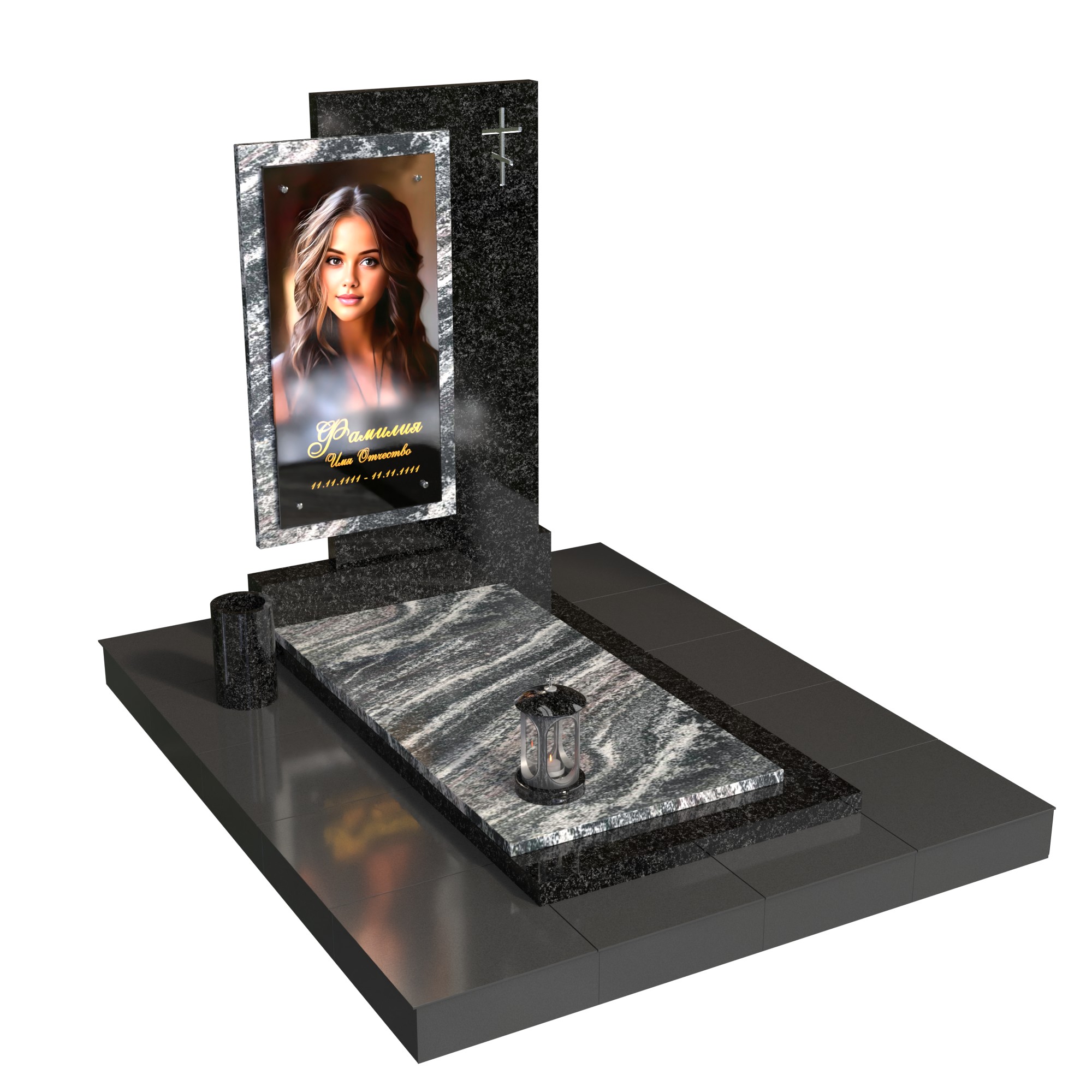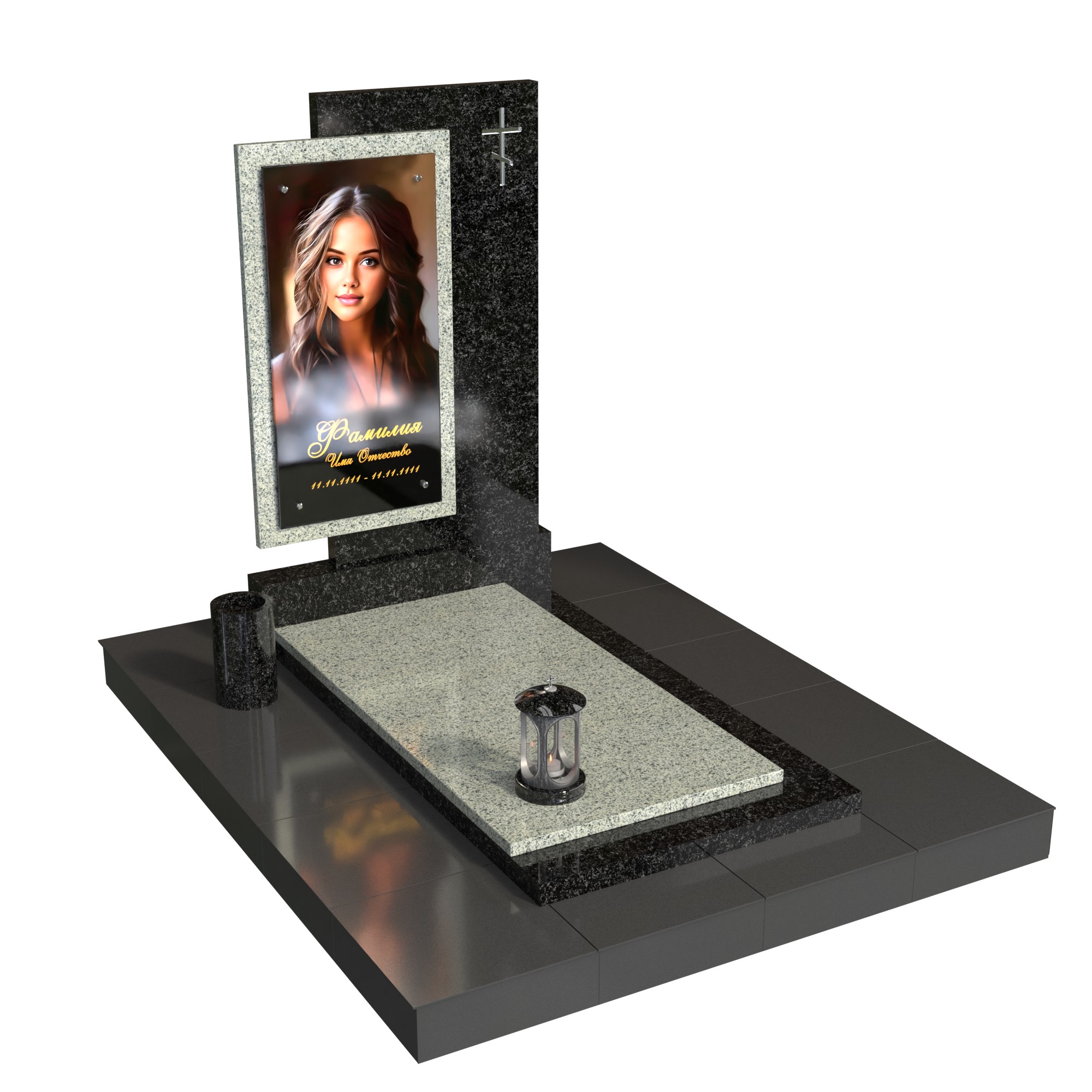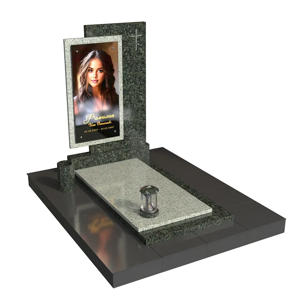 Памятник «Окно памяти» — современная модель из натурального камня с контрастом фактур. Вертикальная стела со стеклянным фотопортретом в декоративной раме (крепление на метизах) и аккуратным крестом создаёт образ достойной, светлой памяти. Двухуровневая плита, цилиндрическая ваза и лампада формируют завершённую композицию и подчёркивают аккуратность благоустройства.