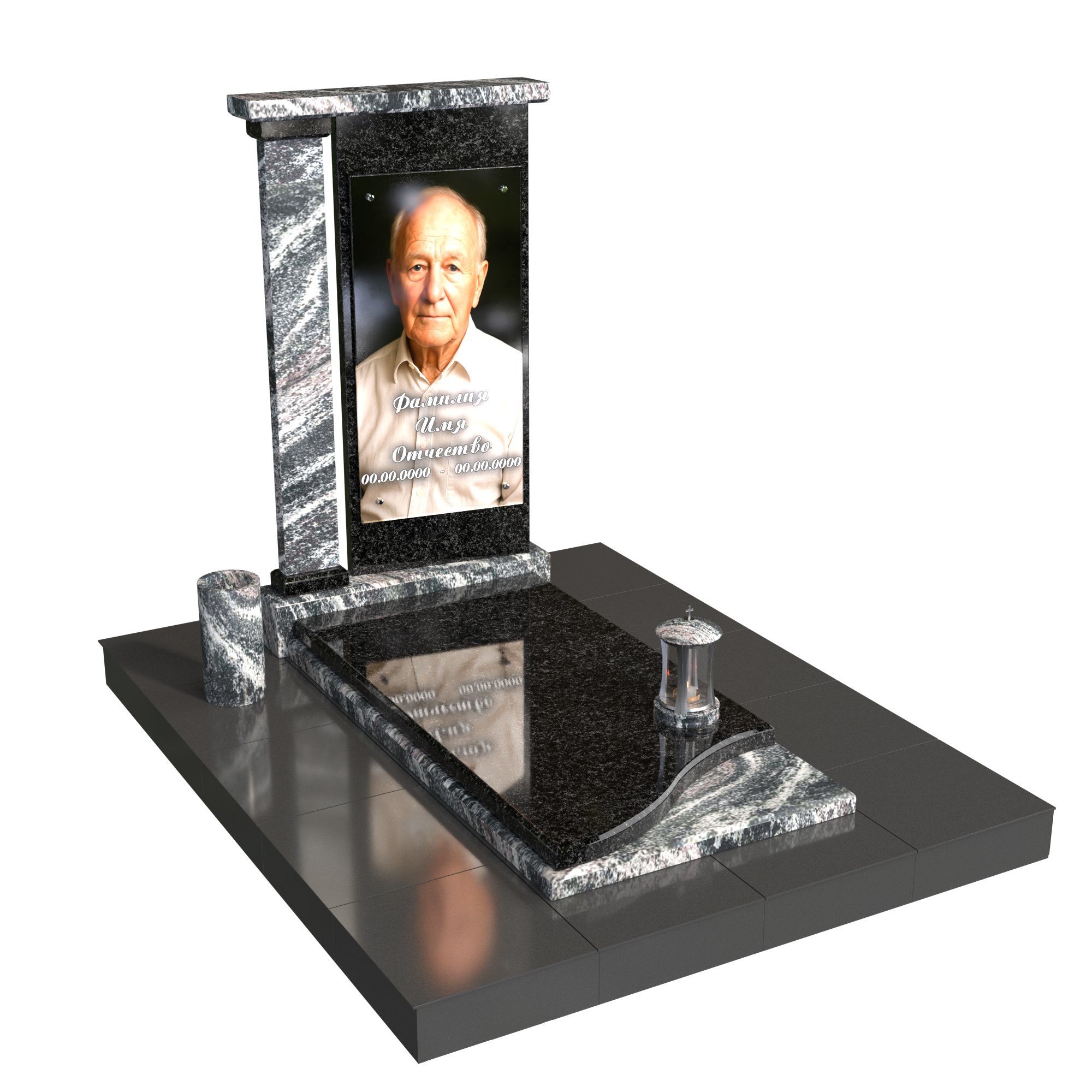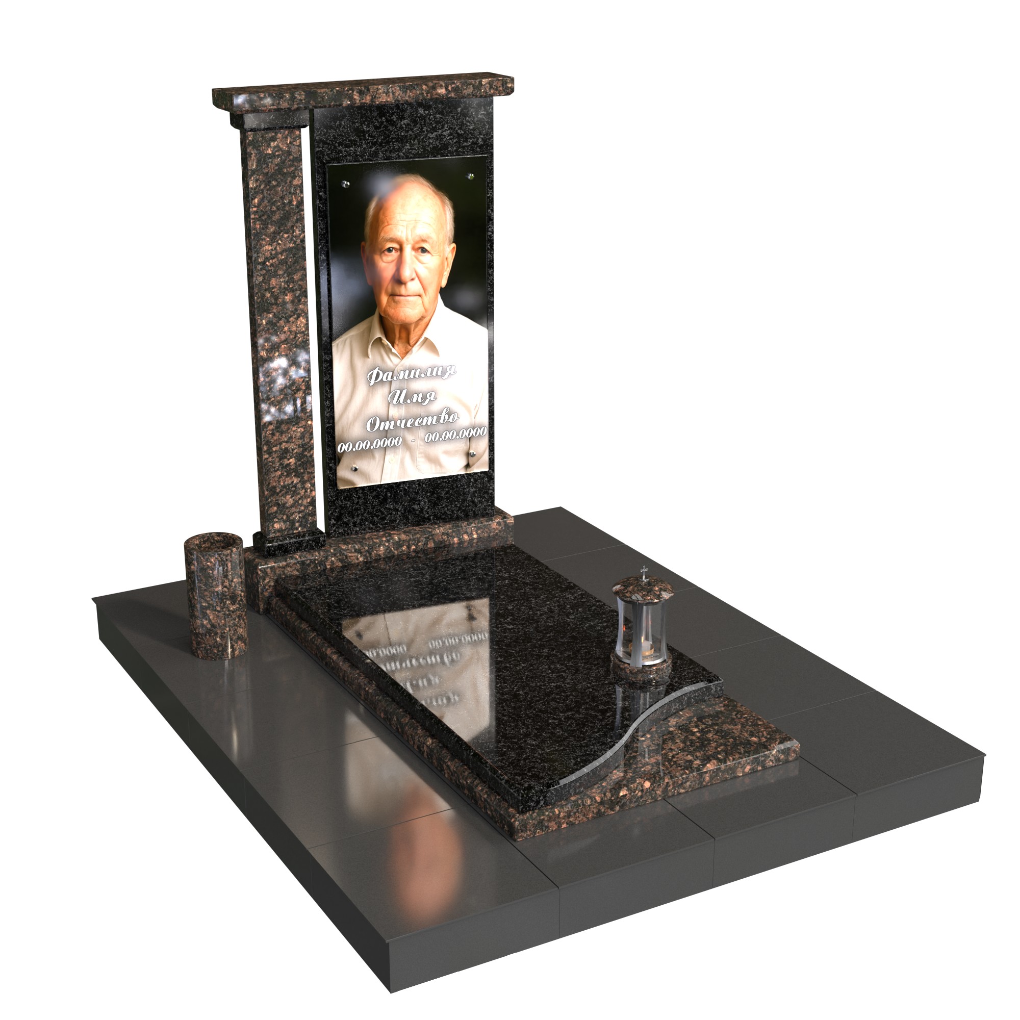 Надгробная плита плавной формы подчёркивает индивидуальность дизайна, а стеклянная лампада и округлая ваза завершают композицию, придавая ей завершённость и утончённость. Использование прочных и долговечных материалов гарантирует сохранность памятника на долгие годы.